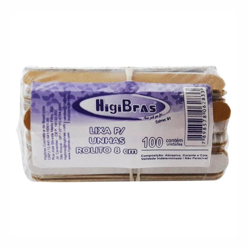 Lixa de unha confeccionada em madeira e revestida papel com grãos abrasivos e adesivo PVA, com dois tipos de grana, grossa para desbaste e fina para acabamento.